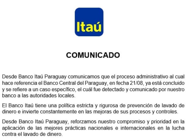 “Desde Banco Itaú Paraguay comunicamos que el proceso administrativo al cual hace referencia el Banco Central del Paraguay, en fecha 21/08, ya está concluido y se refiere a un caso específico, el cuál fue detectado y comunicado por nuestro banco a las autoridades locales”, señala la primera parte del escrito.