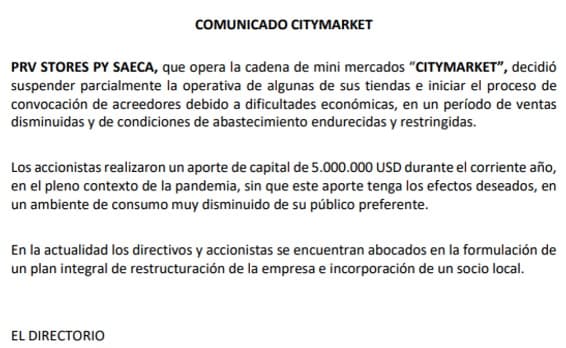 “El grupo empresarial Citymarket estaba teniendo problemas financieros y que hoy iban a estar presentando una convocatoria de acreedores. Son 455 trabajadores que fueron suspendidos en sus contratos”, expresó.