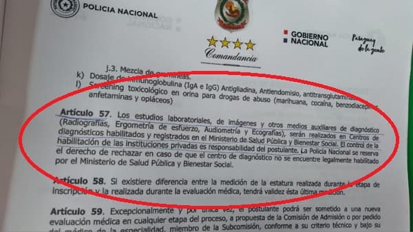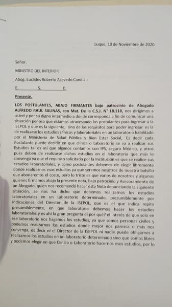 “Hay postulantes que tienen seguros de IPS, a través de sus padres o seguros privados. Sin embargo, la denuncia que nosotros estamos haciendo es que el director de la institución y algunos comisarios salieron afuera de la institución, donde dice que la Isepol va a designar a los postulantes en qué laboratorio se va a hacer su estudio, y eso es lo que para nosotros presumiblemente está mal y eso es lo que nosotros denunciamos ante el Ministerio del Interior para que investigue un poco cuál es el interés de las autoridades de la Isepol para que ellos digan en qué laboratorio se tienen que hacer”, detalló.