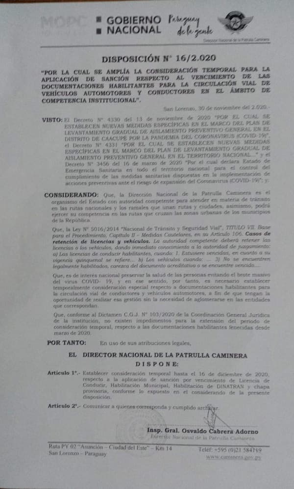 La Disposición N° 16/2020 establece que los controles de vencimiento de licencia de conducir, habilitación municipal, habilitación de DINATRAN y chapa provisoria; aún no serán pasibles de sanciones.