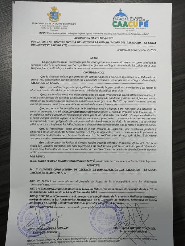 El intendente de la ciudad de Caacupé, Diego Riveros anunció la nueva disposición, tras la aglomeración que se registró en uno de los balnearios durante el fin de semana.