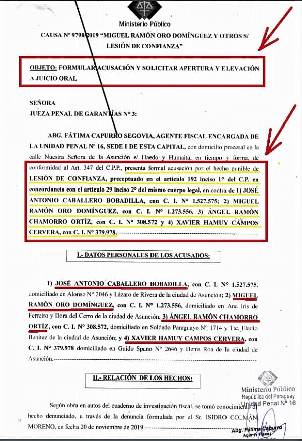 La denuncia realizada por Isidro Colmán Moreno menciona que los procesados incurrieron en actos administrativos irregulares durante su administración.