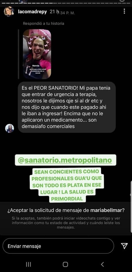 Narró a través de sus historias de Instagram que en el centro asistencial le pidieron la suma de G. 1.200.000 para realizar los primeros procedimientos.