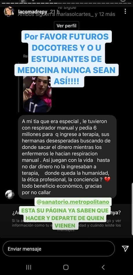 Usó sus redes sociales para replicar el testimonio de otras personas quienes habrían sufrido una experiencia similar en el mismo sanatorio. Además, “La Comadre” se hizo tendencia en Twitter.