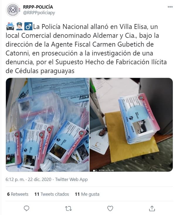 La Policía Nacional informó sobre un inusual allanamiento, en el cual fueron incautadas cédulas de identidad paraguaya, no de personas, sino de animales.