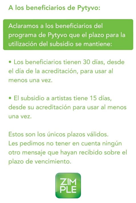 La marca Zimple, de la procesadora Bancard, emitió un comunicado en el cual pide ignorar mensajes recibidos sobre vencimientos y deja en claro los plazos.