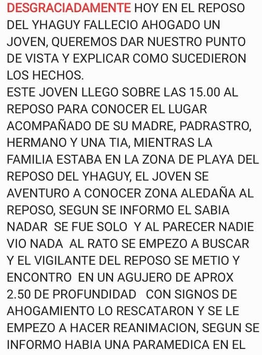 De acuerdo al escrito publicado en la cuenta de Facebook del establecimiento, el joven llegó al sitio a las 15:00 del martes en compañía de sus familiares. En el texto se apunta que el joven se aventuró a conocer una zona aledaña al reposo.