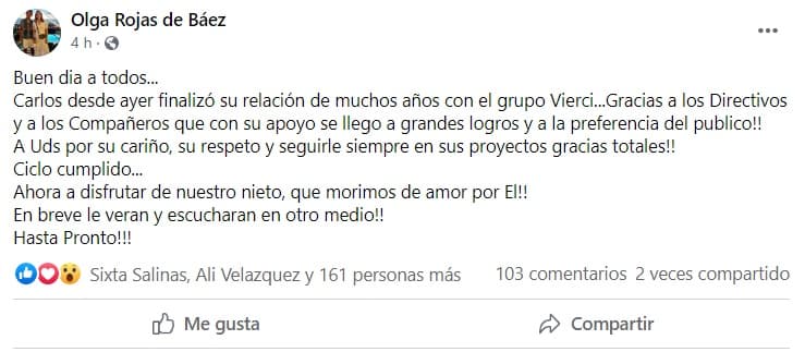 “Carlos desde ayer finalizó su relación de muchos años con el grupo Vierci...Gracias a los Directivos y a los Compañeros que con su apoyo se llegó a grandes logros y a la preferencia del público!! A Uds por su cariño, su respeto y seguirle siempre en sus proyectos gracias totales!! (sic)”, escribió la esposa del periodista.