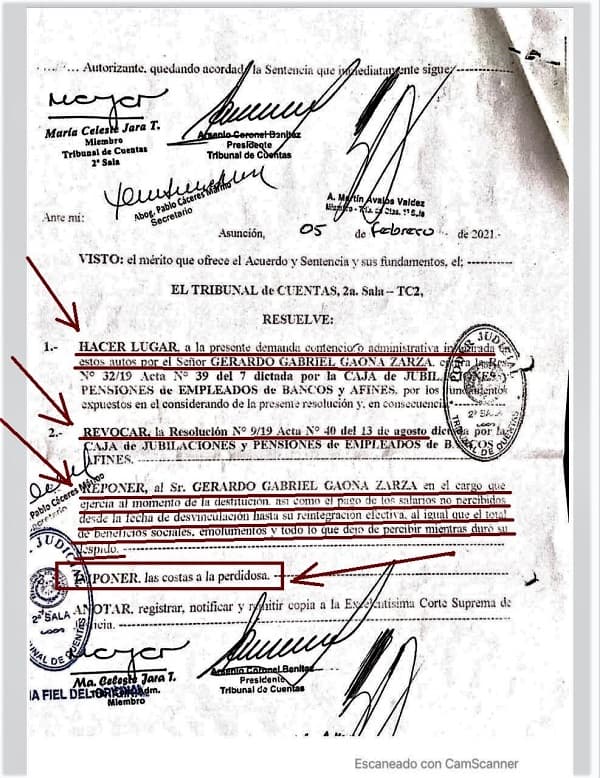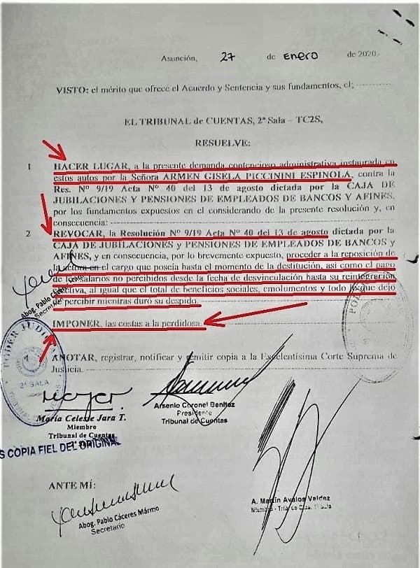 El Tribunal de Cuentas, 2° Sala, resolvió reponer en sus cargos a Armen Gisela Piccinini Espínola y Gerardo Gabriel Gaona Zarza dentro de la Caja Bancaria.
