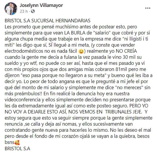 Una joven identificada en Facebook como Joselynn Villamayor publicó una denuncia en redes sociales en la cual habla del pago de salarios irrisorios.