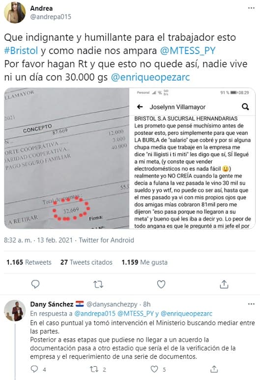 El viceministro de Empleo, Dany Sánchez, informó en Twitter que el Ministerio de Trabajo ya tomó intervención. “En el caso puntual ya tomó intervención el Ministerio buscando mediar entre las partes. Posterior a esas etapas que pudiese no llegar a un acuerdo la documentación pasa a otro estadio que sería el de la verificación de la empresa y el requerimiento de una serie de documentos”, posteó.