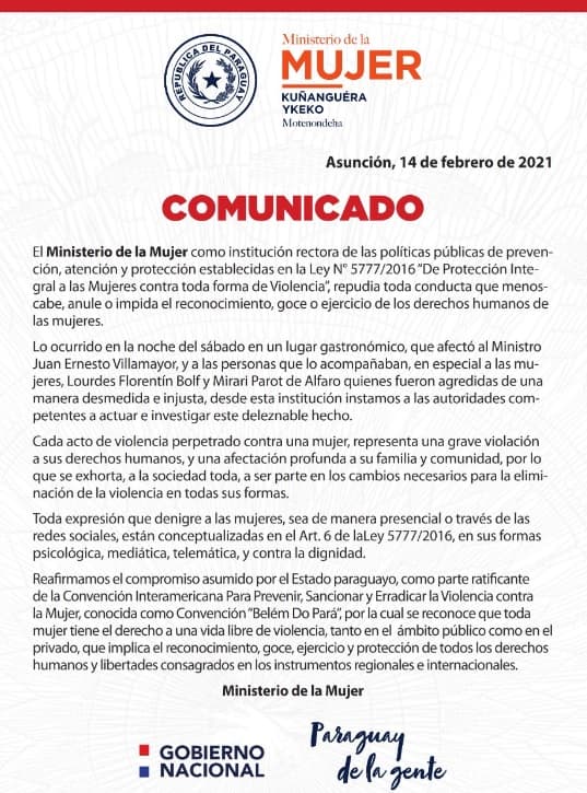 “Lo ocurrido en la noche del sábado en un lugar gastronómico, que afectó al Ministro Juan Ernesto Villamayor, y a las personas que lo acompañan, en especial a las mujeres, Lourdes Florentín Bolf y Mirari Parot de Alfato quienes fueron agredidas de una manera desmedida e injusta, desde esta institución instamos a las autoridades competentes a actuar e investigar este deleznable hecho”, menciona el escrito.