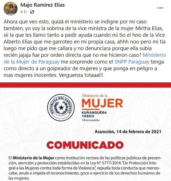 “Ahora que veo esto, quizá el ministerio se indigne por mi caso también, yo soy la sobrina de la viceministra de la mujer Mirtha Elias, sí la que le llamó tanto a pedir ayuda cuando mi tío el hermano de la Vice, Alberto Elias, que me garroteo en mi propia casa, ahhh noo pero mi tía luego me pido que me callara y no denunciara porque ella subía recién jajaja fue por orden directa que no me hicieron caso? El Ministerio de la Mujer me sorprende como el SNPP Paraguay tenga como director a un golpeador de mujeres y que ponga en peligro a más mujeres inocentes. Verguenza total (sic)”, posteó acompañado del comunicado hecho por la cartera del Estado.