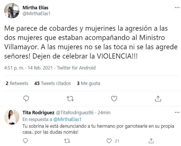 “Me parece de cobardes y mujerines la agresión a las dos mujeres que estaban acompañando al Ministro Villamayor. A las mujeres no se las toca ni se las agrede señores! Dejen de celebrar la violencia”, expresó la alta funcionaria, a través de su Twitter.