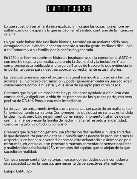 “En L25 hace tiempo cubrimos historias inspiradoras de la comunidad LGBTI+ con mucho respeto y empatía, valorando la diversidad y la inclusión. Y ese compromiso está publicado a lo largo de 6 años de trabajo, lo que evidencia lo importante que es para nosotros abordar correctamente estas historias”, indica el comunicado.