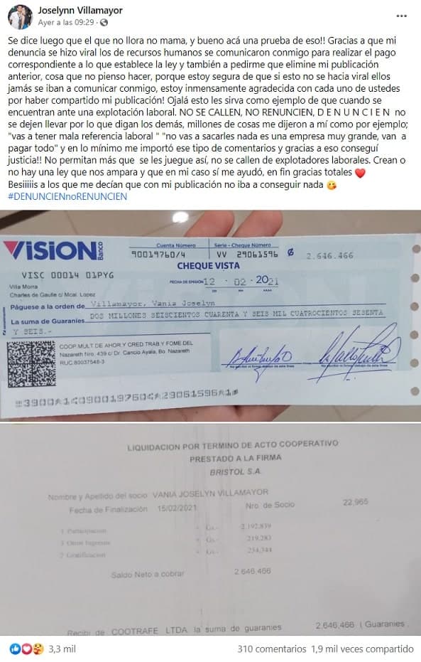 La misma agradeció el apoyo e instó a las personas que atraviesan por la misma situación a no callar, a no renunciar, sino a denunciar, ya que la misma a pesar de todos los comentarios negativos que recibió, logró que la firma le pague más de G. 2 millones.