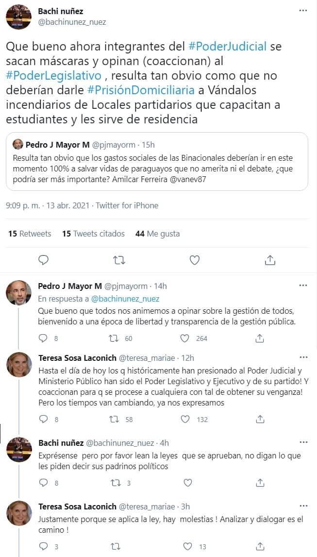 “Que bueno ahora integrantes del Poder Judicial se sacan máscaras y opinan (coaccionan) al Poder Legislativo , resulta tan obvio como que no deberían darle Prisión Domiciliaria a Vándalos incendiarios de Locales partidarios que capacitan a estudiantes y les sirve de residencia (sic)”, manifestó el legislador sosteniendo la postura de su bancada.