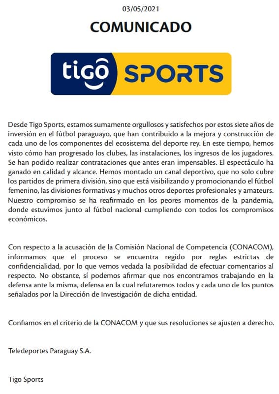 Con relación a la posible sanción, la telefónica emitió un comunicado asegurando que a través del canal Tigo Sports trabaja en favor del deporte nacional, entre otras cosas.