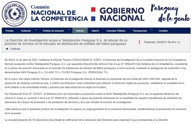 La Dirección de Investigación de la Comisión Nacional de la Competencia (Conacom) recomendó imponer una multa de USD 6.085.000 a Teledeportes Paraguay S.A. por abusar de su posición de dominio y de abarcar las trasmisiones del fútbol paraguayo.