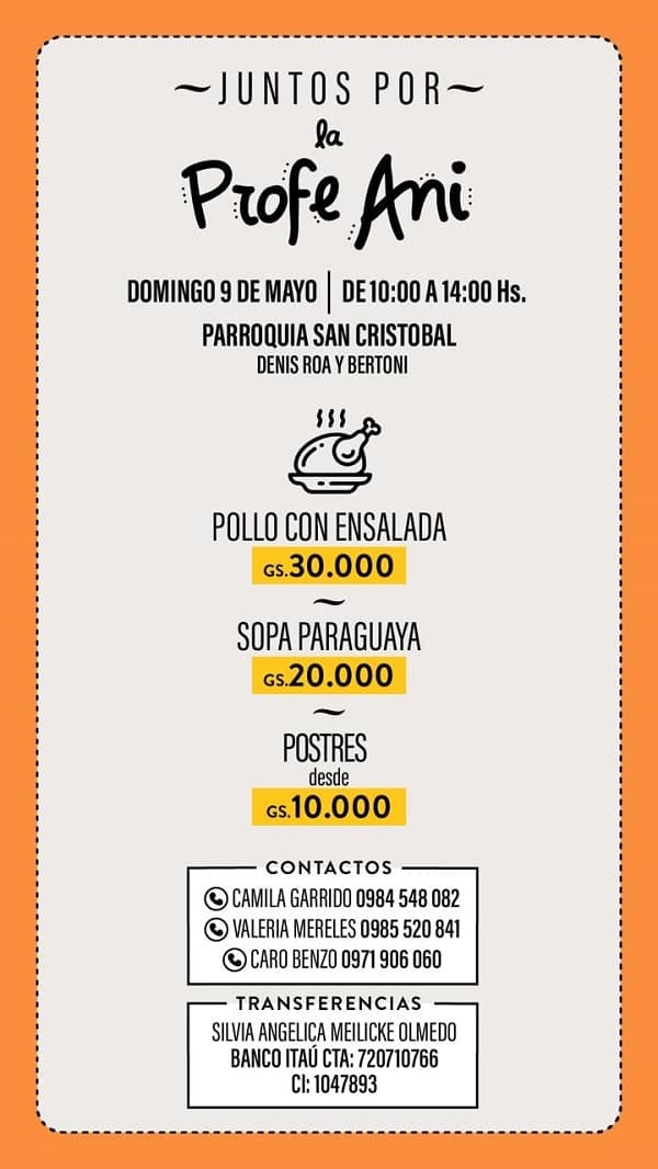 El próximo domingo 9 de mayo desde las 10:00 hasta las 14:00 en la Parroquia San Cristóbal ubicada sobre las calles Denis Roa y Bertoni se ofrecerá a los interesados platillos como: pollo con ensalada, sopa paraguaya y postres.
