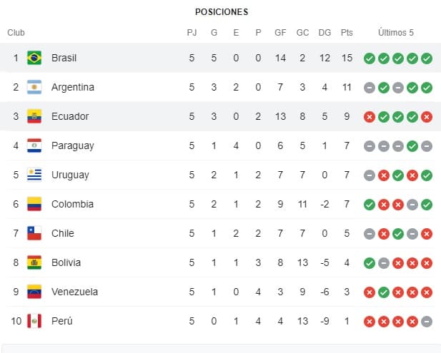 El cuadro verdeamarelo suma 15 puntos, fruto de cinco victorias y es el único puntero. Por su parte, Ecuador se mantiene con 9 unidades.