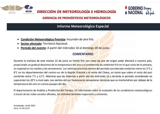 Las mínimas serán de entre 5 a 8 grados en los departamentos del centro-sur de la Región Oriental y del oeste del Chaco, en tanto que en el resto del país oscilarían entre 7 y 11 grados, indica el escrito publicado por la dependencia.