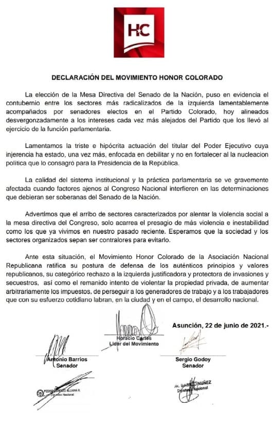 Hugo Velázquez, vicepresidente de la República, en contacto con Radio 1000 AM, dijo no coincidir con el comunicado que emitió el movimiento Honor Colorado, liderado por Horacio Cartes y lo calificó como apresurado.