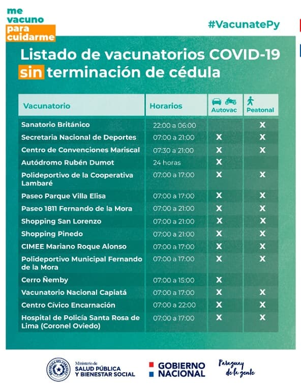 En los demás, que no son mencionados en la lista oficial, se debe seguir respetando el orden de numeración. Este miércoles deben asistir las personas de 35 años de edad en adelante con terminación de cédula 2 al 3, informan desde Telefuturo.