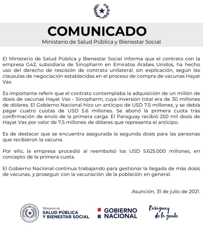 “El contrato contemplaba la adquisición de un millón de dosis de vacunas Hayat Vax – Sinopharm, cuya inversión total era de 30 millones de dólares. El Gobierno Nacional hizo un anticipo de USD 7.5 millones, y se debía pagar cuatro cuotas de USD 5.6 millones. Se abonó la primera cuota tras confirmación de envío de la primera carga. El Paraguay recibió 250 mil dosis de Hayat Vax por valor de 7.5 millones de dólares que representa el anticipo”, apunta el texto publicado.