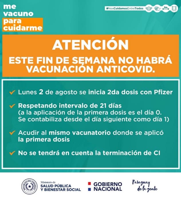 Los horarios de vacunación de los centros vacunatorios habilitados por la cartera sanitaria están disponibles en la página www.vacunate.gov.py, donde se estará actualizando todo acerca de la vacunación de segundas dosis, de acuerdo a lo informado por la agencia IP.