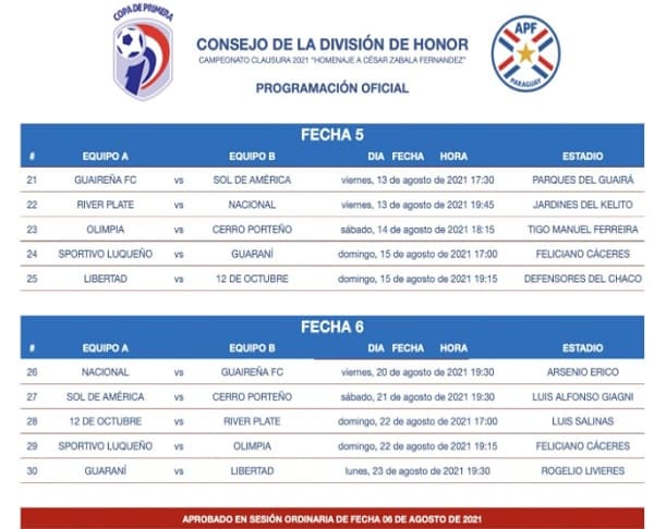 El Consejo Divisional Profesional de la Asociación Paraguaya de Fútbol (APF) se reunió este viernes y estableció el calendario de las fechas 5 y 6 del Torneo Clausura.