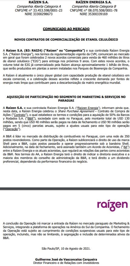 La conformidad establece los términos y condiciones para el traspaso del 50% del paquete accionario de la distribuidora de combustibles de B&R a Raízen Energía y fue firmado luego de un exhaustivo proceso de revisión estratégica de ambas partes, refiere el escrito que fue difundido por el periodista Juan Carlos Bareiro en redes sociales.