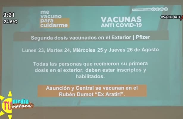 Además, indicó que quienes accedieron a la primera dosis de Pfizer en el exterior podrán completar el esquema a nivel local. Para quienes viven en Asunción y Central el vacunatorio habilitado será en el Autódromo Rubén Dumot, de Capiatá. Las demás personas deberán recurrir a sus respectivas regiones, apuntó.