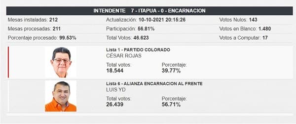 De esta manera, Luis Yd gobernará por segundo periodo consecutivo tras derrocar al Partido Colorado del poder, después de una hegemonía de 75 años y por lo cual la ANR buscaba recuperar el poder en esa localidad.