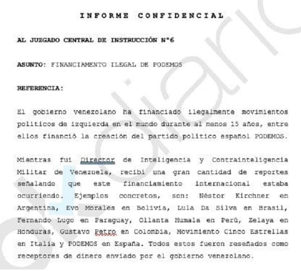 “Mientras fui director de Inteligencia y Contrainteligencia Militar de Venezuela, recibí una gran cantidad de reportes señalando que este financiamiento internacional estaba ocurriendo. Ejemplos concretos, son: Néstor Kirchner en Argentina, Evo Morales en Bolivia, Lula Da Silva en Brasil, Fernando Lugo en Paraguay, Ollanta Humala en Perú, Zelaya en Honduras, Gustavo Petro en Colombia, Movimiento Cinco Estrellas en Italia y Podemos en España”, mencionó el exgeneral.