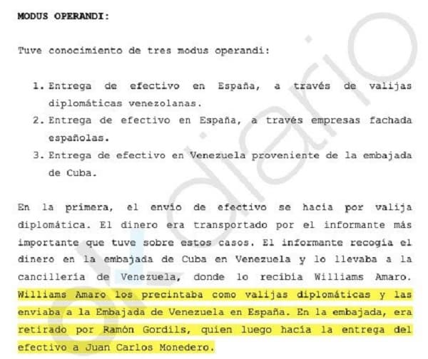 “El dinero era transportado por el informante más importante que tuve sobre estos casos. El informante recogía el dinero en la Embajada de Cuba en Venezuela y lo llevaba a la cancillería de Venezuela, donde lo recibía Williams Amaro. Williams Amaro lo precintaba como valija diplomática y enviaba el dinero a la Embajada de Venezuela en España. En la Embajada, era retirado por Ramón Gordils, quien luego hacía la entrega del efectivo a Juan Carlos Monedero”, relató.