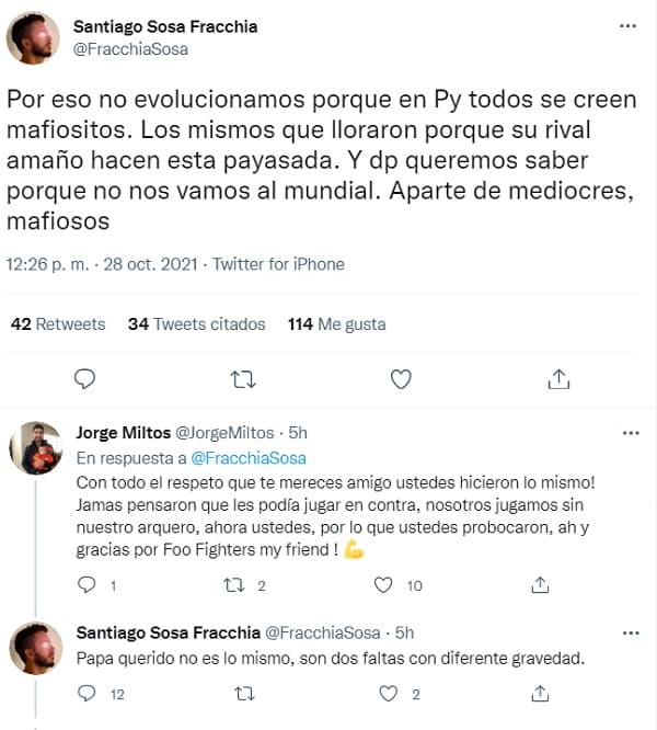 “Por eso no evolucionamos porque en Py todos se creen mafiositos. Los mismos que lloraron porque su rival amaño hacen esta payasada. Y dp queremos saber porque no nos vamos al mundial. Aparte de mediocres, mafiosos (sic)”, tuiteó.