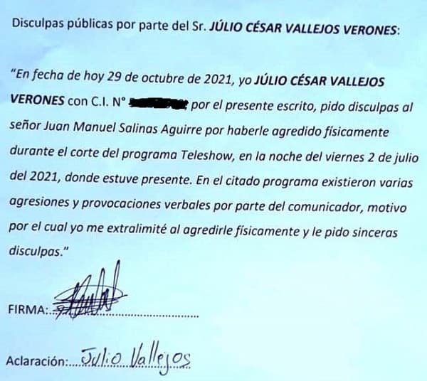 “Yo, Júlio César Vallejos Verones (...), por el presente escrito, pido disculpas al señor Juan Manuel Salinas Aguirre por haberle agredido físicamente durante el corte del programa Teleshow, en la noche del viernes 2 de julio del 2021, donde estuve presente. En el citado programa existieron varias agresiones y provocaciones verbales por parte del comunicador, motivo por el cual yo me extralimité al agredirle físicamente y le pido sinceras disculpas”, es lo que expresa el documento de disculpas, en el marco del acuerdo.