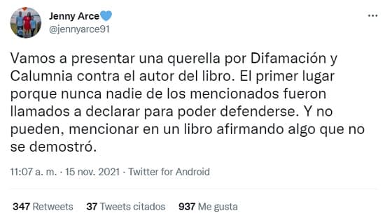 “Santo y Seña se llama el libro, donde mencionan a mi marido. No vamos a dejar pasar devalde. Sinceramente, como sea vamos a luchar contra los que están detrás de semejante injusticia (sic)”, respondió en otro tuit.