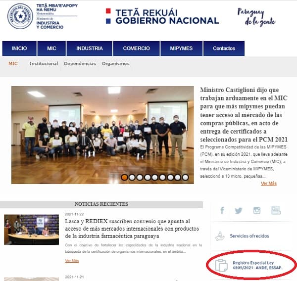 Los interesados deberán acceder a la página web del Ministerio de Industria y Comercio www.mic.gov.py. En el margen lateral derecho se encuentra el apartado “Registro Especial Ley 6809/2021 – ANDE, ESSAP”, donde deberán dar click para completar el formulario con los datos de la empresa.