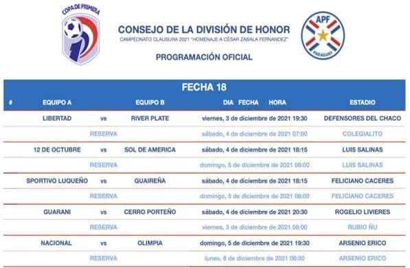 La fecha 18 arrancará el viernes 3 de diciembre con el partido entre Libertad y River Plate a las 19:30 en el estadio Defensores del Chaco.