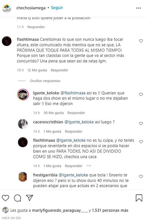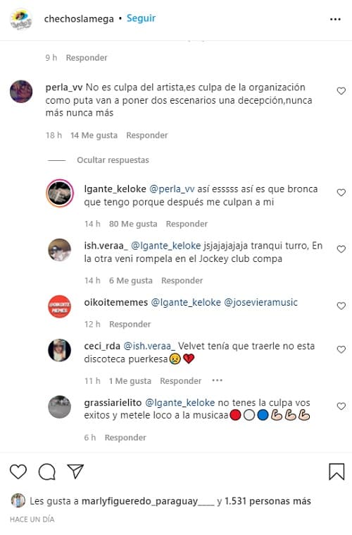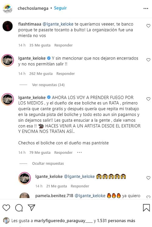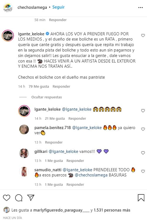 “AHORA LOS VOY A PRENDER FUEGO POR LOS MEDIOS , y el dueño de ese boliche es un RATA , primero quería que cante gratis y después quería que repita mi trabajo en la segunda pista del boliche y todo esto aun sin pagarnos y sin dejarnos salir!! Les gusta ensuciar a la gente , dale vamos con esa !! HACES VENIR A UN ARTISTA DESDE EL EXTERIOR Y ENCIMA NOS TRATAN ASÍ.. (sic)”, comentó el cantante en la cuenta de Instagram de ChechoS.