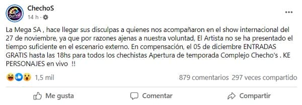López, propietario del local nocturno, lanzó su versión de los hechos en conversación con ABC TV. “Nosotros nos vimos en la necesidad de aclarar la situación porque nos debemos a un público que hace a que nuestra organización cuente con más de 23 años de trayectoria, nunca hemos tenido un problema similar, hace realmente a la situación de la locación, todos saben que ChechoS tiene un escenario y uno externo, mintieron de inicio a fin, nadie les pidió que hagan un show gratis”, comenzó diciendo.