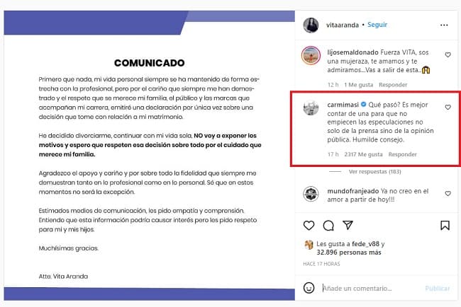 “Qué pasó? Es mejor contar de una para que no empiecen las especulaciones no solo de la prensa sino de la opinión pública. Humilde consejo”, fue el comentario publicado por la mediática Carmiña Masi, que juntó otra serie se reacciones en el posteo original de Vita.