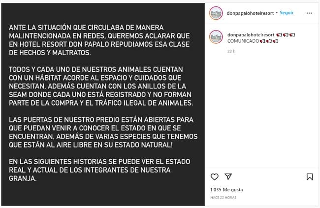 Tras la viralización del video, durante la jornada del martes, Granja Don Papalo había publicado un escrito en redes en el cual negaba las malas condiciones de los animales.