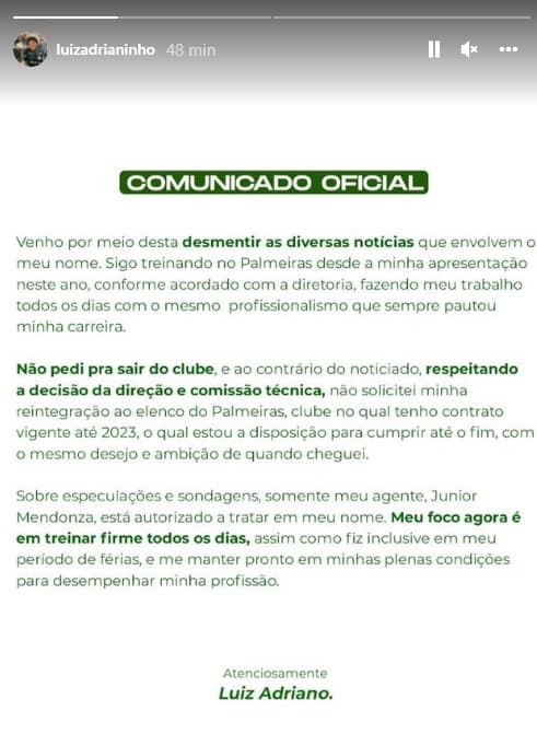Dijo además que está a disposición para cumplir con el vínculo vigente con la entidad de la ciudad de São Paulo.