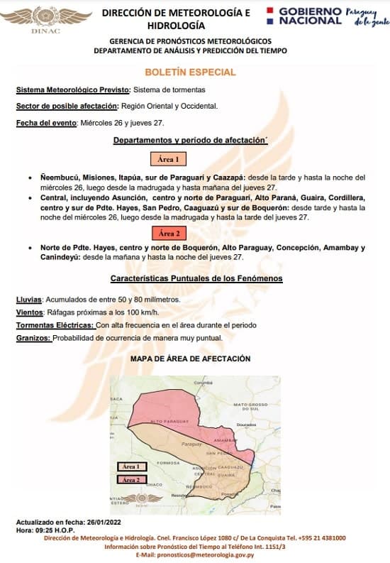 El boletín de la dependencia, los primeros departamentos alcanzados serían Ñeembucú, Misiones, Itapúa, sur de Paraguarí y Caazapá; desde la tarde y hasta la noche del miércoles 26, luego desde la madrugada y hasta mañana del jueves 27.