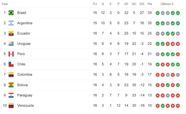 Con la goleada, Brasil está con 39 unidades, mientras que Paraguay se mantiene penúltima y eliminada con 13 puntos.