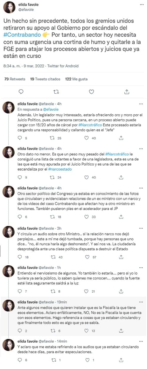 La encargada de Comunicación de la Fiscalía realizó un llamativo hilo en Twitter hablando de los casos de narcotráfico y contrabando develado en los últimos días, además del juicio político.
