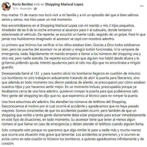 Rocío Benítez relató los tensos minutos que pasaron en familia, cuando el ascensor del Shopping Mariscal López cayó dejándolos atrapados por varios minutos.